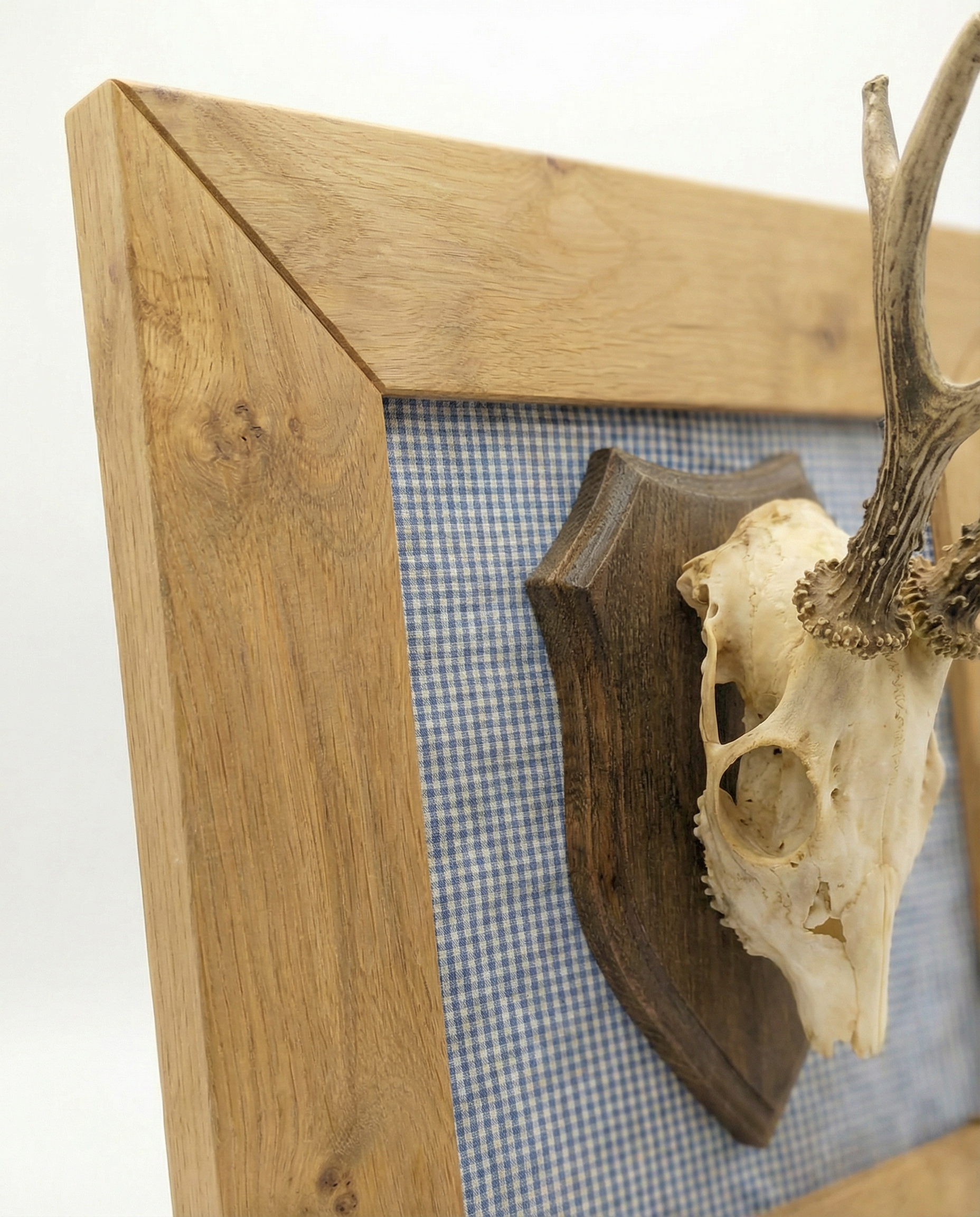 Jedes Geweih im Rahmen wird aus hochwertiger, nachhaltig gewonnener Eiche gefertigt und sorgfältig geschliffen. Durch die Maserung ist jedes Stück ein Einzelstück.