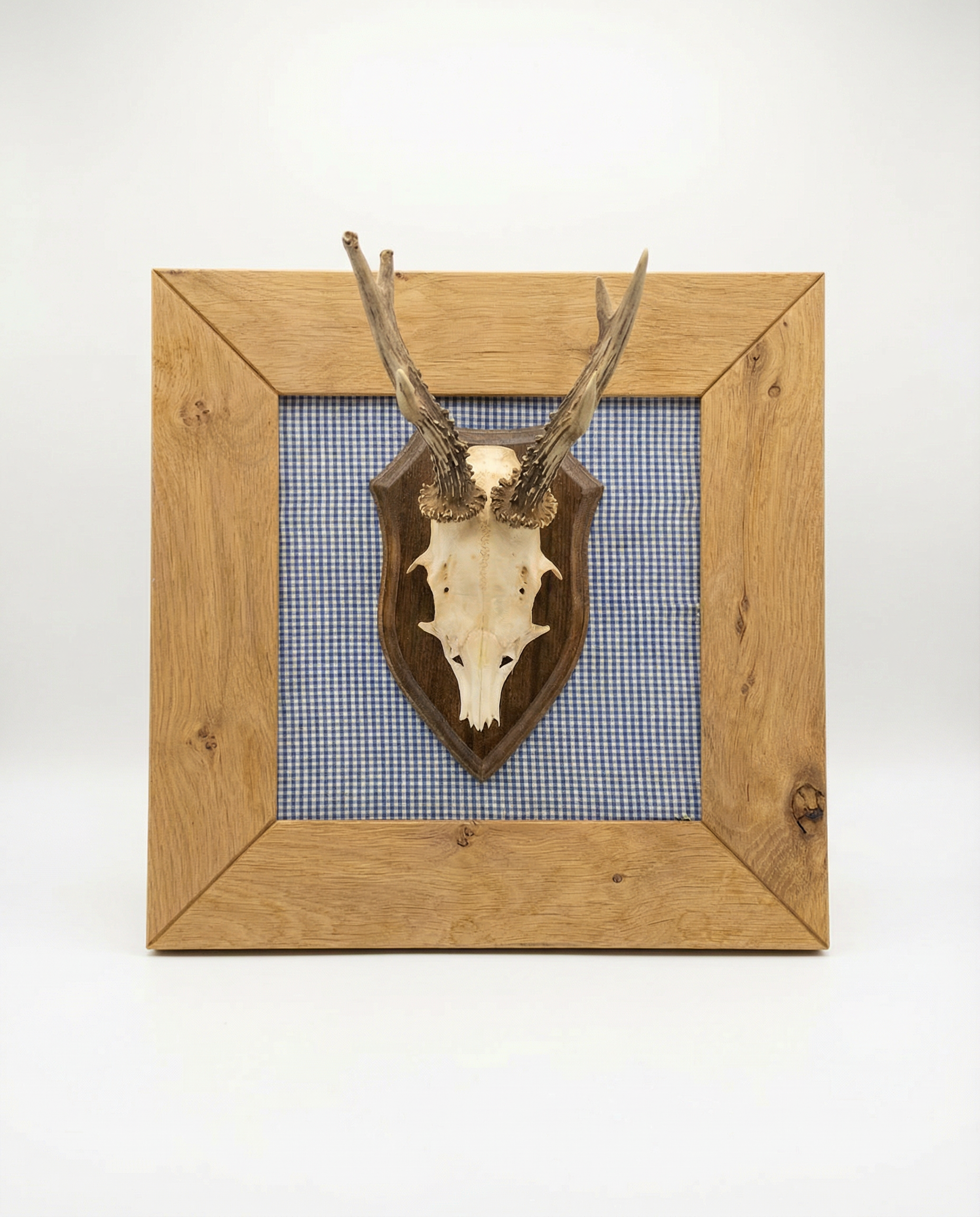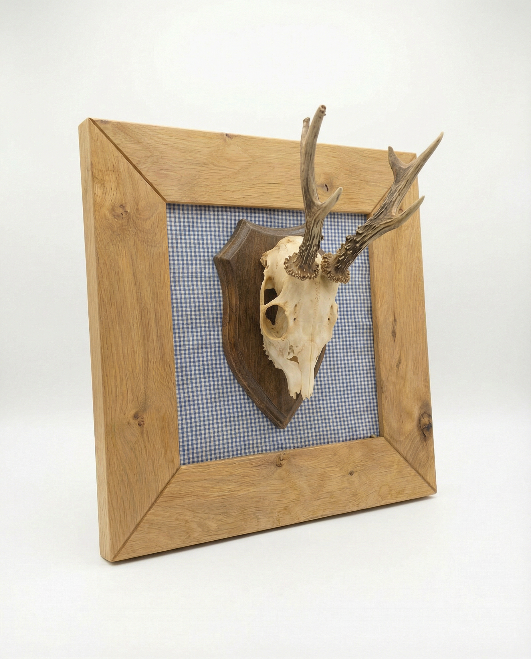 Das Geweih im Rahmen aus massiver Eiche ist ein besonderes Stück Handwerkskunst - gefertigt in liebevoller Handarbeit in Deutschland. Die feine Maserung des Holzes und das schlichte Design machen es zu einem stilvollen Hingucker auf Kommode, Fensterbank oder als Dekoration im Kinderzimmer.