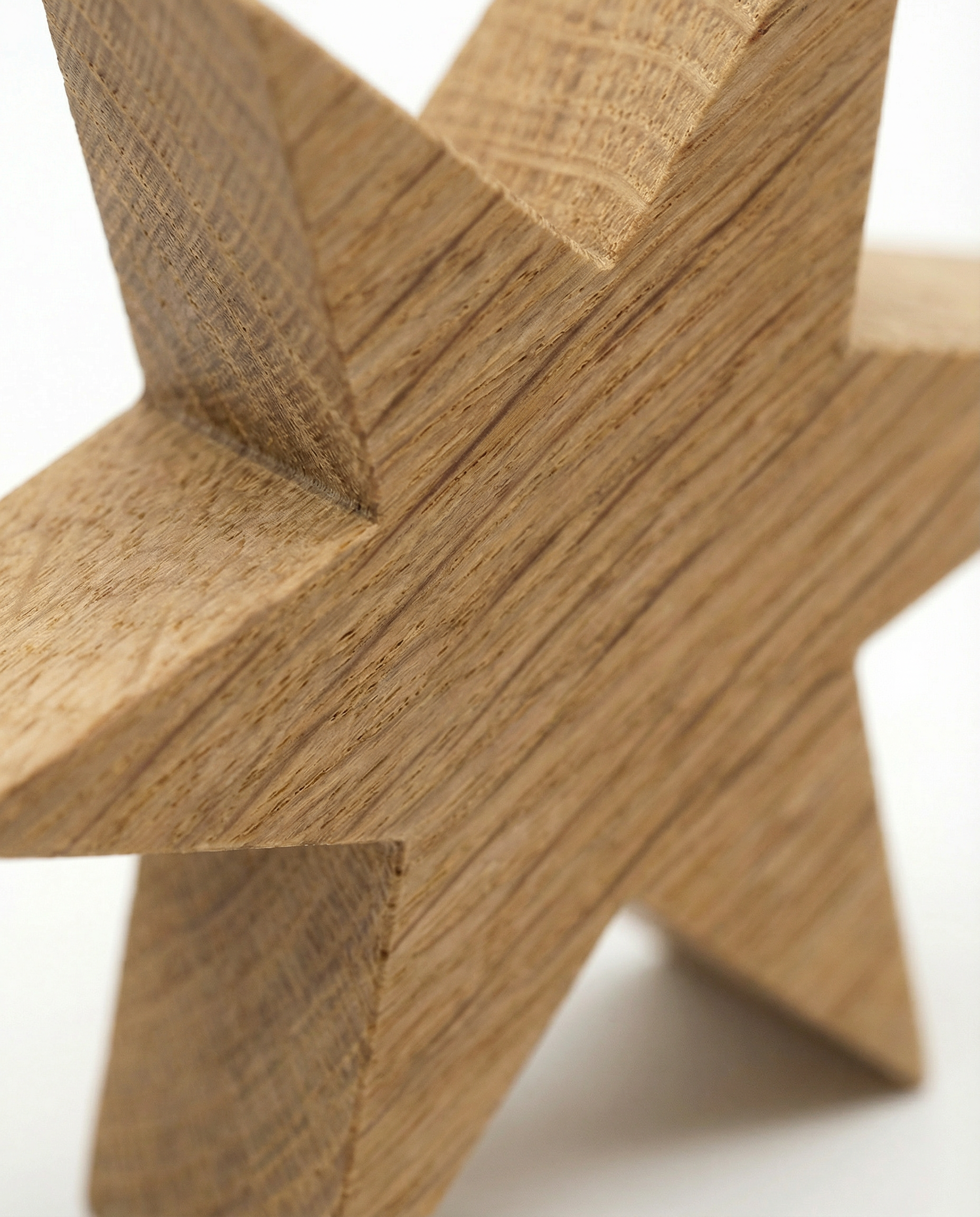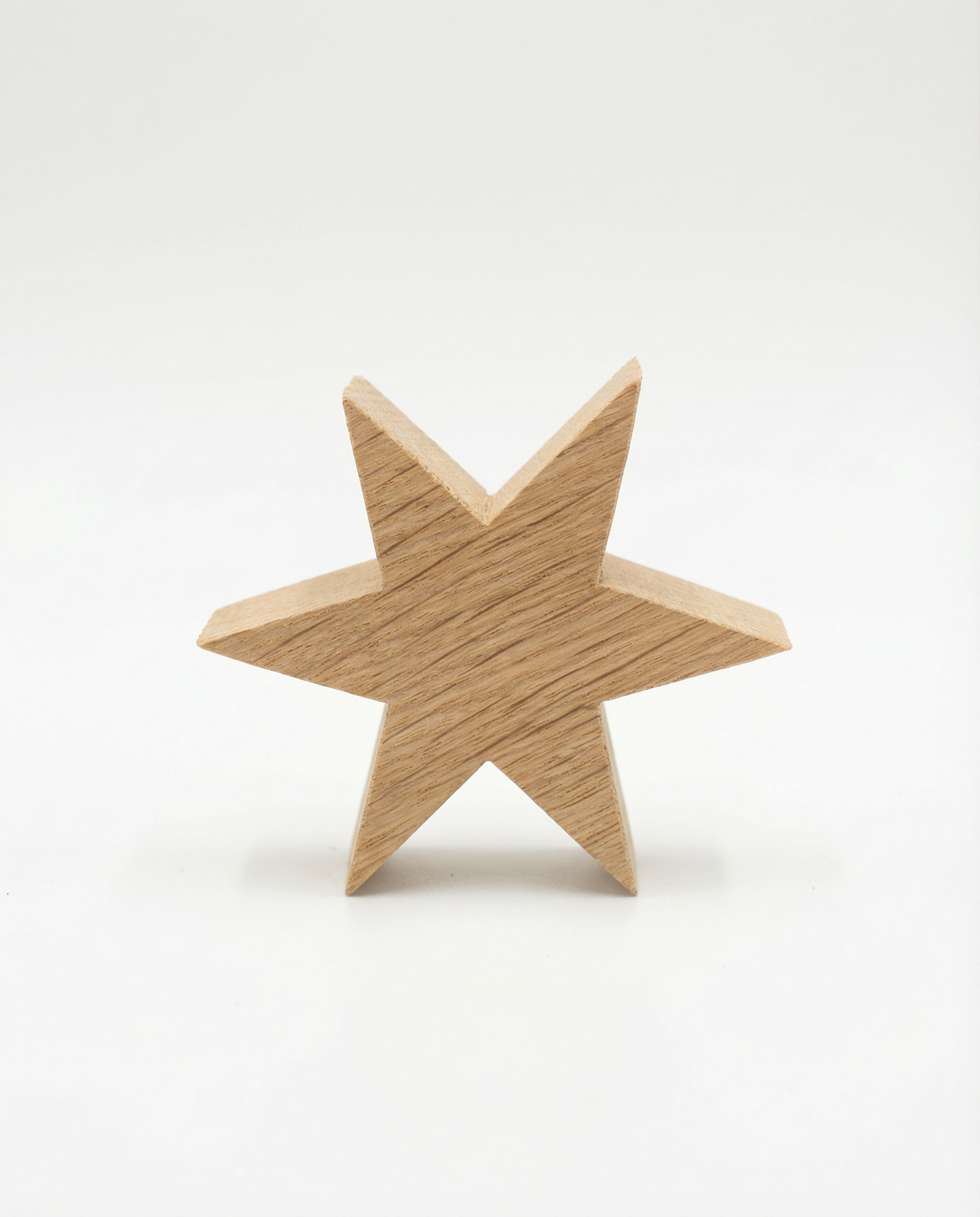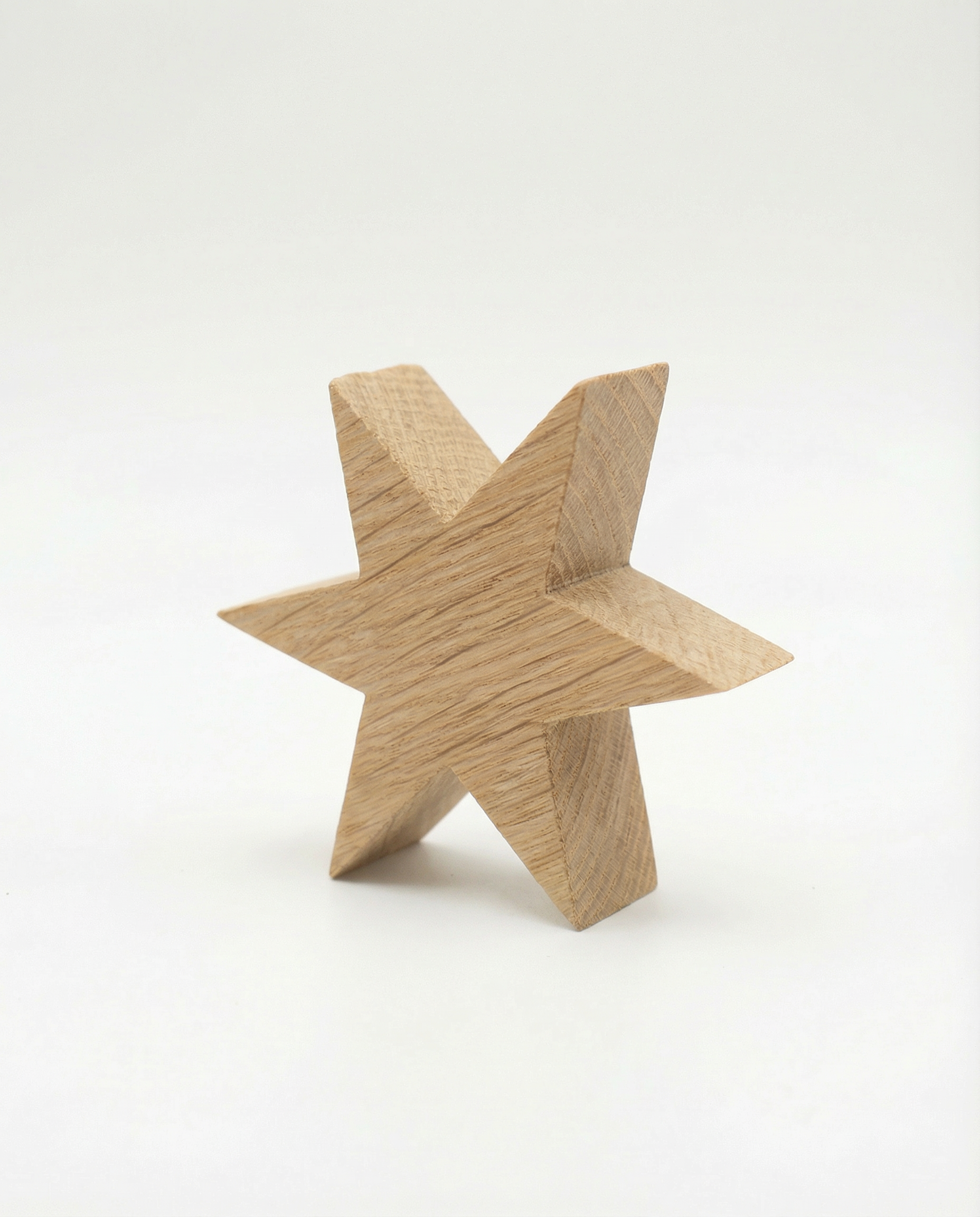 Handgefertigte Sterne aus massiver Eiche, die zeitlose Eleganz in jeden Raum bringen. Jedes Stück wird sorgfältig von Hand gefertigt und besticht durch die natürliche Maserung des hochwertigen Holzes. Die Serie umfasst fünf Größen – von XS (7 cm) bis XL (24 cm Durchmesser) – und ermöglicht flexible Gestaltungsmöglichkeiten für Wand- oder Regaldekorationen. Die robuste Verarbeitung garantiert Langlebigkeit, während die schlichte Form sich harmonisch in verschiedene Einrichtungsstile einfügt. Ideal als Einzelstück oder kombiniert für visuelle Tiefenwirkung.